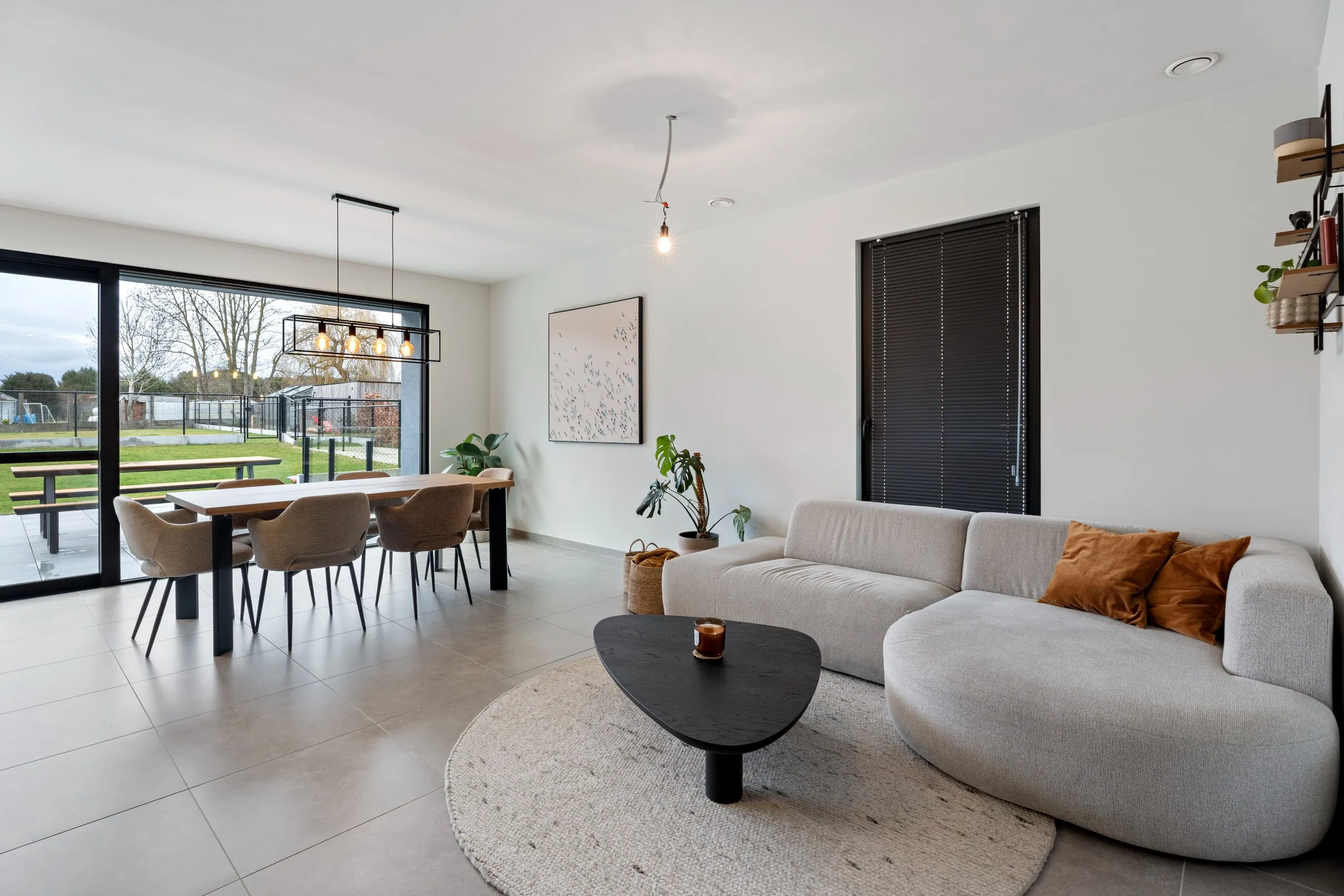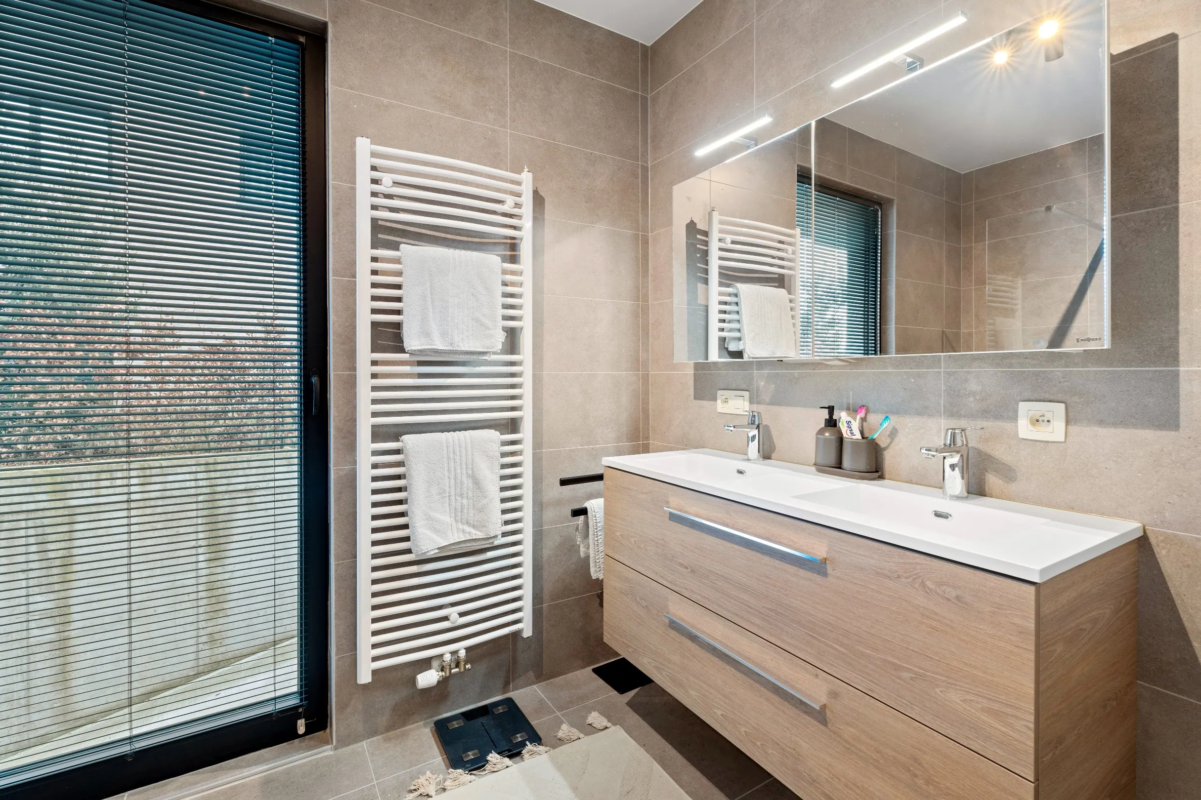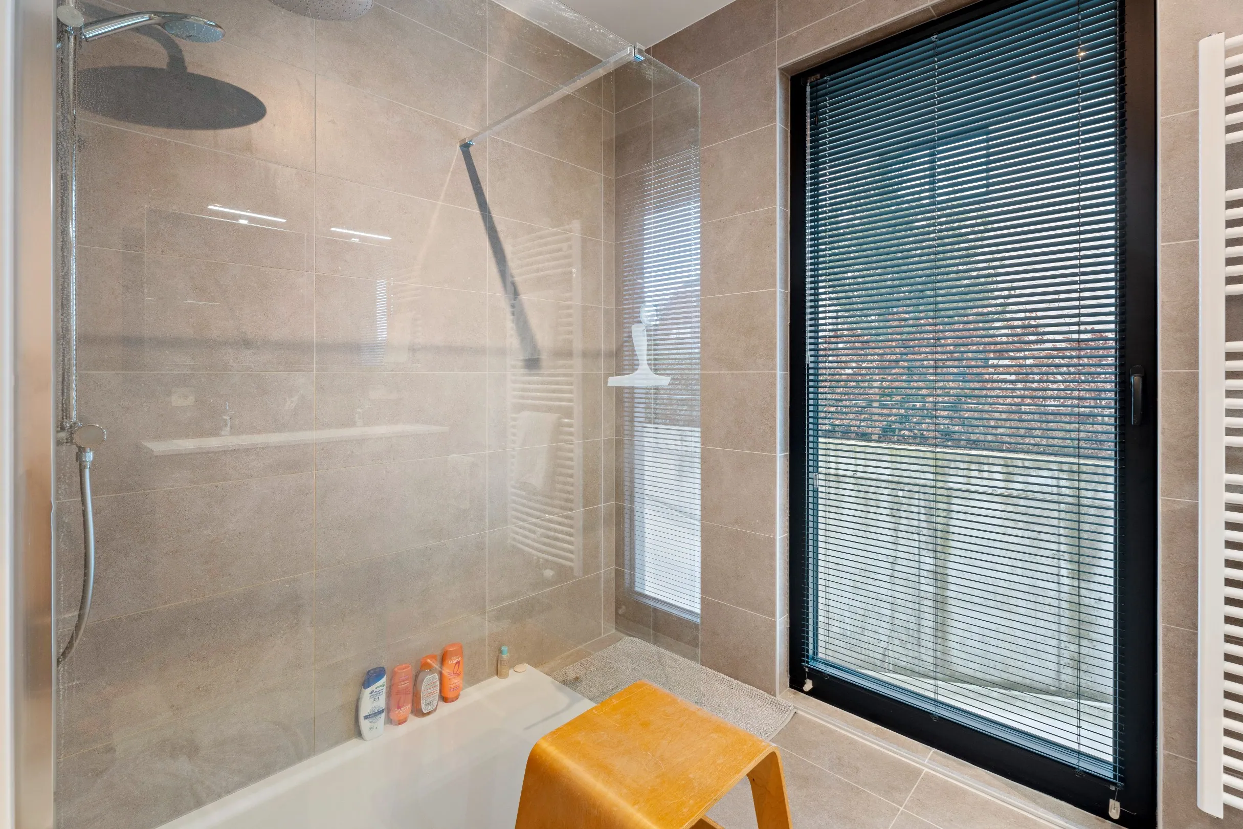 De ruime leefruimte met open keuken geeft zicht op het grote, goed georiënteerde terras en tuin. Naast de keuken is een praktische berging. Er zijn 2 slaapkamers (± 14m² en ± 12m²), een toilet en een badkamer met dubbele lavabo in een meubel en een ruime inloopdouche.